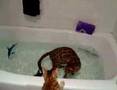 Description: Bengal cat chasing tail in bathtub. |